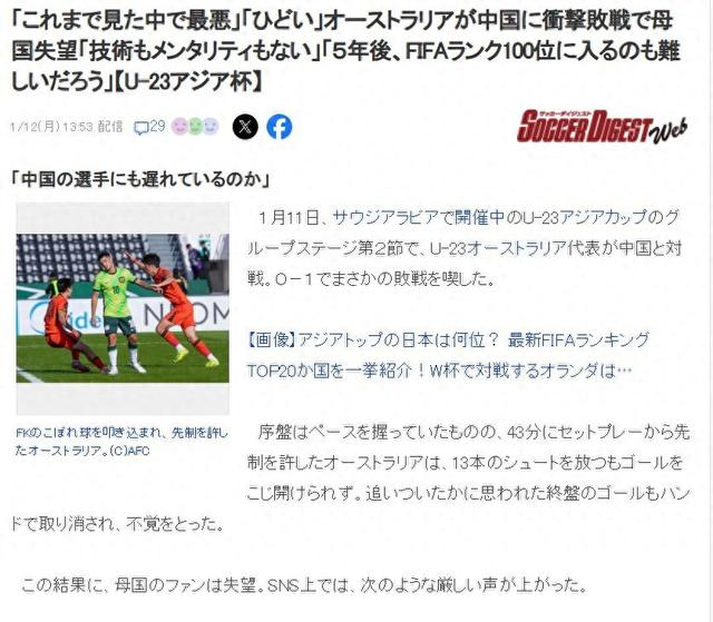U23亚洲杯上,中国队1比0击败Australia,绝对是一场史诗级的成功,这场爆冷也直接引爆了Australia各方的剧烈反映,Australia球迷乃至最先呼吁解雇这支球队的主锻练,媒体也发文反思球队的表示。