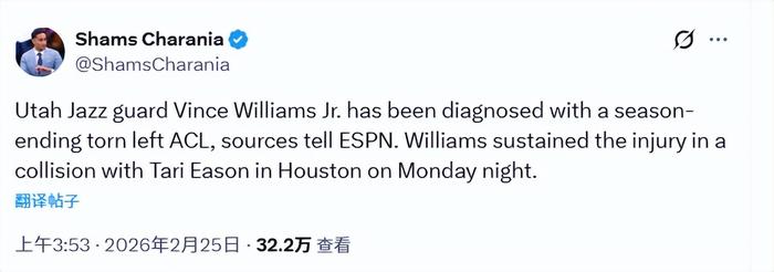 北京时候2月25日,据名记Shams报导,在接管进一步查抄后,爵士球员小文斯-威廉姆斯确诊为左膝前交叉韧带(ACL)扯破。这一伤势不但让威廉姆斯直接报销2025‑26赛季,依照这类伤病的常规恢复周期,他2026‑27赛季的年夜部门时候也极可能没法出战。